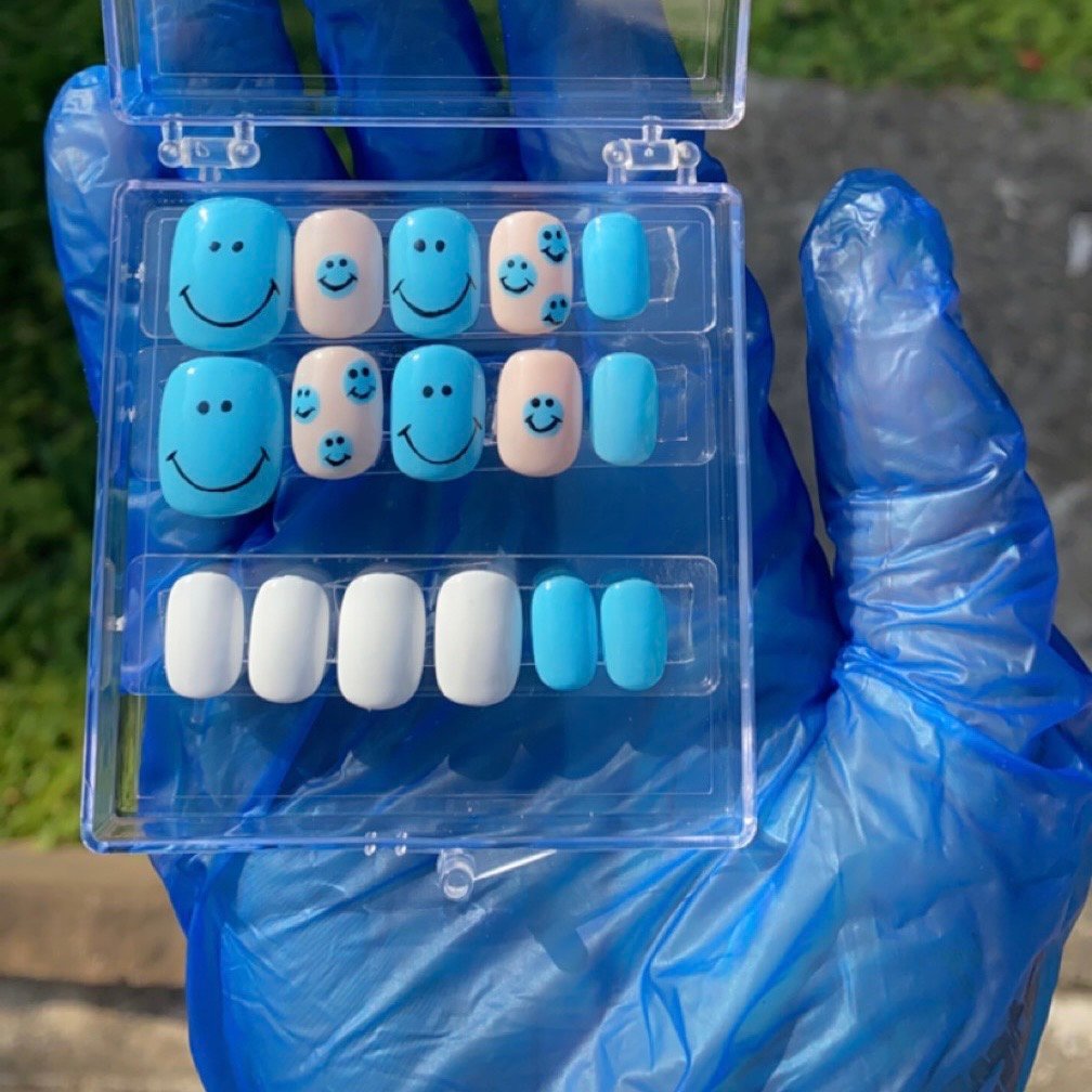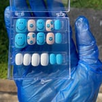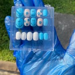for ages 8 & up. a cerulean blue and white gel polish with 100% hand painted nail art.